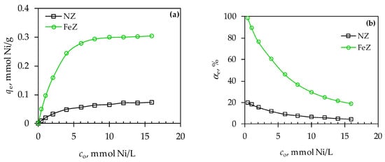 The results of the effect of the initial Ni(II) concentration on the amount of Ni(II) sorbed per gram of NZ and FeZ, as well as the removal efficiency, αe are shown in Figure 6.