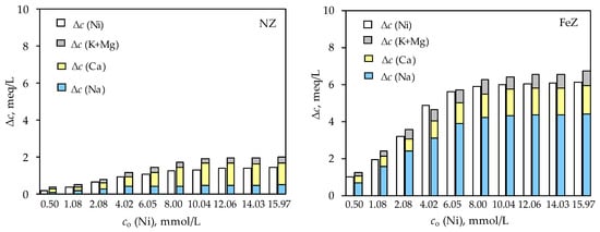 In the current study, the observed maximum amount of sorbed Ni(II) is four times higher on FeZ compared to NZ (0.305 mmol/g vs. 0.073 mmol Ni/g, Figure 6a), which is impressive and justifies the zeolite modification procedure. The increase in the sorption capacity of FeZ is a consequence of the modification that enhanced the zeolite’s negative charge by incorporating Fe species onto the outer and inner surfaces of the zeolite particles, and thus the number of active centers. The resulting negative charge is partly neutralized by the presence of exchangeable alkali and alkaline earth cations, with sodium being the most prevalent. In order to determine the relationship between the amount of sorbed Ni(II) on NZ and FeZ as well as the quantity of released exchangeable ions (Na, K, Ca, and Mg) from the zeolite, the results were compared and presented in Figure 7.