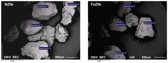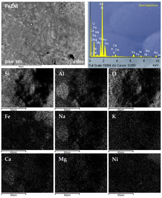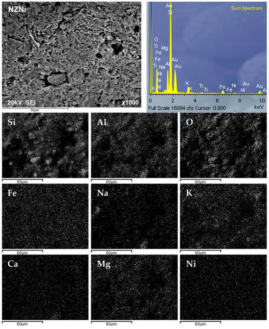 Scanning electron microscopy (SEM) combined with energy-dispersive X-ray analysis (EDS) of nickel-saturated samples, NZNi and FeZNi, was performed on a JEOL JSM-6610 microscope. On selected surfaces of the analyzed samples, the semi-quantitative chemical composition was determined, and the distribution of elements on the surface was determined by mapping analysis.