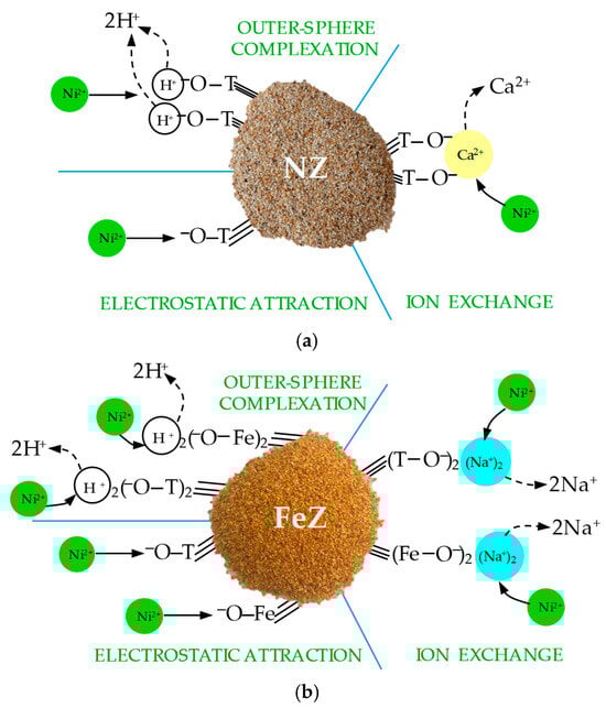 Furthermore, several studies have been carried out on natural zeolites converted to the homoionic form. Thus, Al-Haj Ali et al. [67] applied Jordanian phillipsite zeolite tuff converted to the sodium homoionic form and obtained a sorption capacity of 0.341 mmol Ni/g at pHo = 4. Çoruh and Ergun [68] examined the sorption of Ni(II) on natural and Na-conditioned clinoptilolite zeolite from the Manisa-Gördes site in western Anatolia (Turkey) and established a 1.2-fold increase in capacity on the conditioned zeolite in relation to the starting material (0.17 mmol/g vs. and 0.14 mmol/g). Rajić et al. [69] achieved a sorption capacity of 0.180 mmol Ni/g at pHo = 6 using natural zeolite tuff (clinoptilolite) from a Serbian Zlatokop deposit converted into sodium form. Abatal et al. [70] obtained a sorption capacity on clinoptilolite-rich zeolite tuff from Puebla State (Mexico) converted to the Na-homoionic form of 0.005 mmol Ni/g at pHo = 6. Mehdi et al. [71] tested the binding of nickel to the sodium form of Algerian natural zeolite mordenite and achieved a capacity of 0.500 mmol/g at pHo = 5.27. Biblioteca et al. [72] investigated the possibility of using natural and sodium-conditioned zeolite clinoptilolite by simulating conditions in the gastrointestinal tract. Thus, using a Ni(II) solution of 0.034 mmol/L (2 mg/L) at pHo = 4.5, they determined nickel binding of 0.002 mmol/g and 0.003 mmol/g on natural and conditioned zeolite, respectively. Experimental reports indicate that Ni(II) sorption on natural zeolites was carried out at optimal pH, without the possibility of precipitation. In addition, the observed deviations in sorption capacities of zeolites are a consequence of the mineralogical and chemical features of the used zeolites, as well as experimental parameters such as the zeolite–solution contact time, solid/liquid ratio, and initial nickel concentration.