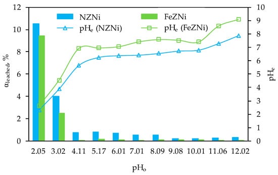 Leaching of Ni(II) from the collected saturated samples (NZNi and FeZNi) took place after conducting the experiment described in Section 2.2.3. Samples were subjected to the standard leaching method, DIN 38414 S4 [79]. Ultrapure water with pH pre-adjusted with 0.1 mol/L HNO3 or 0.1 mol/L KOH in the range of 2.05–12.02 was used as leachant. A mass of 1.0 g of NZNi or FeZNi was mixed with 10 mL of ultrapure water of different pHo for 24 h at 25 rpm and at 25 °C. After 24 h, the equilibrium pHe and the concentration of leached Ni(II) were determined in the filtered suspensions by AAS.