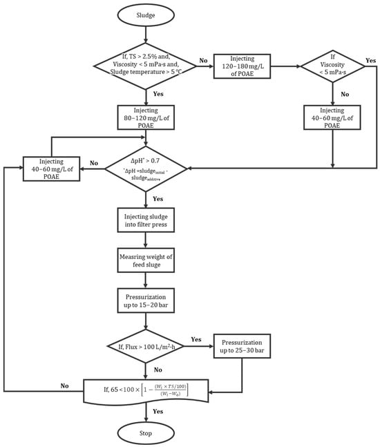 The control strategy is summarized in the flowchart (Figure 1), which outlines the sequential decision steps from initial sludge characterization to the end of dewatering. Key elements of the algorithm include