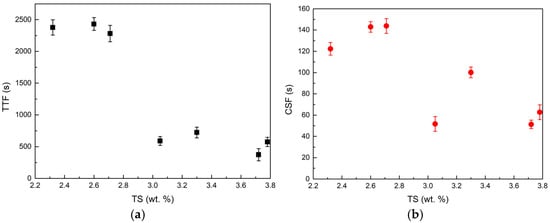 Effect of sludge total solids (TS) on dewatering time; (a) TTF, (b) CST.