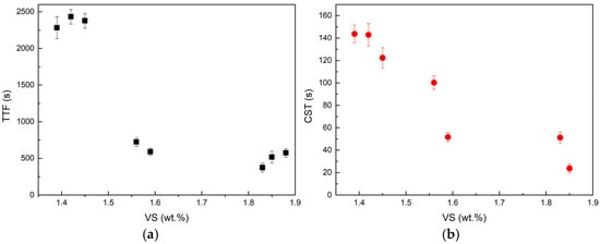 The volatile solids (VS) content of sludge directly reflects the proportion of organic matter, which is closely associated with viscosity and capillary suction time (CST). Figure 3 shows the relationship between VS. (1.3–1.9 wt.%) and dewatering metrics (TTF and CST).