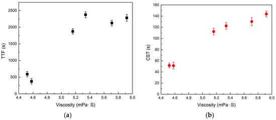 Effect of viscosity on dewatering time; (a) TTF, (b) CST.