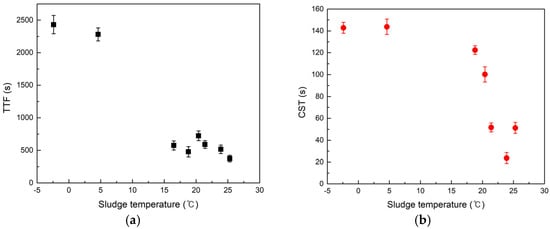 Figure 5a shows TTF results for sludge dewatered at different temperatures (~–2 °C up to ~25 °C). There is a clear trend of improving dewatering with higher temperature, a similar trend to previous studies [23]. At near-freezing (~0 ± 2 °C), TTF values were extremely high (~2200–2400 s), indicating very slow dewatering (in fact, sludge dewatering performance is known to deteriorate drastically at such low temperatures [20]). In contrast, by ~20–25 °C, TTF dropped to ~400–700 s. The relationship is nonlinear: the most dramatic improvements occur in the lower range (e.g., warming from 5 °C to 15 °C yields a far larger TTF reduction than going from 15 °C to 25 °C). This suggests that cold sludge suffers greatly in dewatering efficiency, likely because (1) water viscosity increases by roughly 30–50% when cooling from 20 °C to 5 °C, directly reducing filtration rates; (2) polymer/coagulant efficacy is lower at low temperatures (slower floc formation and reduced polymer chain flexibility) [24,25]; and (3) the sludge flocs’ physical structure can trap more water at low temperature (the floc network becomes less pliable), which is consistent with the notion that floc properties strongly determine dewaterability [4,26].