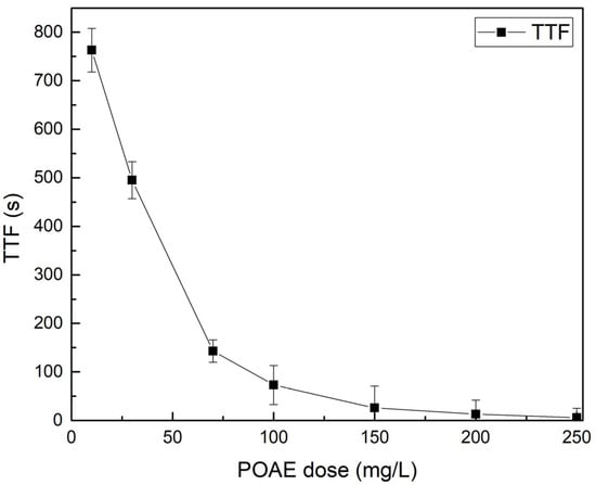 Increasing the dosage of POAE markedly improves sludge dewatering efficiency up to an optimal range. As shown in Figure 6, the TTF of conditioned sludge drops sharply with rising POAE dose, indicating faster water release and better dewaterability. For example, increasing a cationic polymer dose from 0 to 25 mg/L was reported to shorten CST (capillary suction time, analogous to TTF) from ~21 s to ~15 s, with an optimal dose around 15 mg/L, beyond which no further gains were observed [28]. Such behavior is typical of polymer conditioning: insufficient dose leaves many colloids unflocculated, whereas an adequate dose neutralizes particle charges and forms large flocs, dramatically reducing filtration resistance [28]. Indeed, at optimum polymer dosing, studies have noted >90% reductions in dewatering indices like CST and SRF (specific resistance to filtration) compared to untreated sludge [29]. Beyond the optimal (~100–150 mg/L POAE in this study), TTF plateaued, consistent with diminishing returns or even slight restabilization when overdosing occurs.