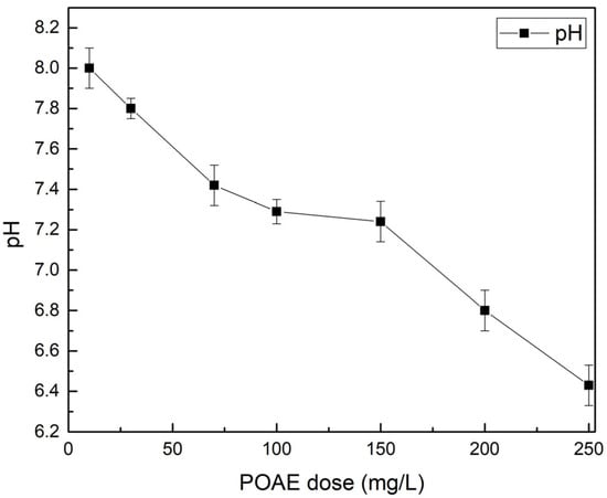 POAE addition was also found to affect sludge pH significantly (Figure 7). As the coagulant dose increased, the filtrate pH decreased measurably, indicating acidification of the sludge system. This pH drop (ΔpH) provides a convenient operational proxy for coagulant action: a larger ΔpH implies more polymer has reacted with the sludge. Prior research confirms that adding cationic coagulants can consume alkalinity and lower the sludge pH in proportion to dose [30]. For instance, Wang et al. observed that higher doses of metal coagulants drove sludge pH progressively lower, evidencing an ongoing hydrolytic acidification during charge neutralization [30]. In practical terms, the magnitude of pH depression can serve as a real-time indicator of dosing adequacy—once the pH has dropped into a target range, the polymer dose is likely sufficient. This approach could enable operators to move away from trial-and-error dosing; instead, monitoring ΔpH online offers immediate feedback to fine-tune polymer addition.