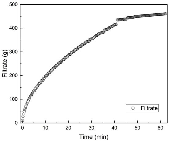 Experimental observation under real-time pressure control revealed behavior consistent with compressible cake theory. As shown in Figure 9, cumulative filtrate mass increased over time in a parabolic fashion. Approximately 100 g of filtrate was collected within the first 5 min, and around 300 g by 30 min. The rate of accumulation gradually declined and plateaued near 450 g at the 60 min mark. This trend indicates an initially high flux that decreased as the cake thickened, in agreement with classical compressible filtration theory [34].