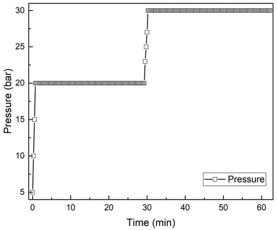 Notably, when dynamic pressure control was applied, the total filtrate recovery (~450 g) exceeded that achieved under a constant-pressure regime (e.g., 20 bar throughout). Literature reports that even doubling pressure from 0.3 MPa to 0.6 MPa often results in only marginal additional filtrate volume (e.g., moisture content reduction from 82.6% to 80.4%) [36]. In contrast, in the present study, increasing pressure from 20 bar to 30 bar after 30 min enabled an additional reduction in cake moisture content by more than 10 percentage points, indicating a significantly enhanced dewatering effect through pressure staging (Figure 10). This performance enhancement aligns with the dual-phase filtration–compression strategy described by La Heij et al. [37], where a first filtration stage at 0.3–0.4 MPa achieved 60–65% cake moisture, while reaching below 40% moisture required extremely high pressures (6–10 MPa). In the present work, final cake moisture reached approximately 65% using a maximum pressure of 3 MPa, representing optimal dewatering within practical pressure limits. Similar trends were reported by Zhao and Bache, who observed diminishing returns in dewatering efficiency beyond certain pressure and time thresholds [38]. Wu et al. [39] also identified critical pressure limits beyond which further pressurization negatively impacted dewatering kinetics. These findings corroborate the effectiveness of pressure step-up strategies to maximize dewatering performance.