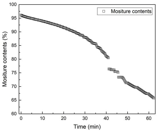 During the filtration process, cumulative filtrate mass () was continuously recorded. The wet cake mass () at a given time, t was calculated by subtracting the filtrate mass from the initial wet sludge mass (). Using the known initial dry solids mass (), cake moisture content was calculated using the following equations (assuming negligible solids loss during filtration):