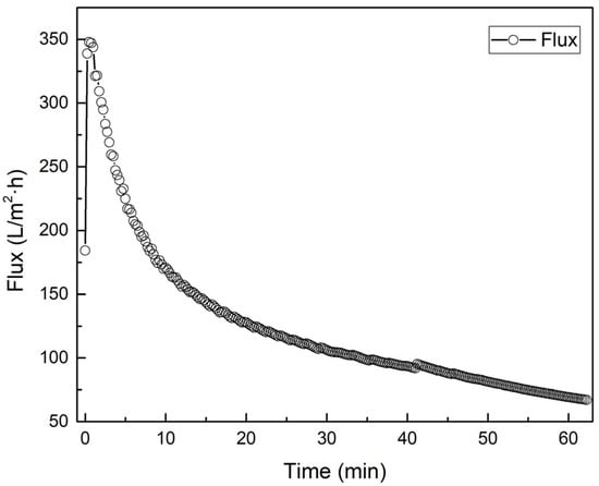 The variation in instantaneous filtration flux under real-time pressure control exhibited a characteristic decline over time, as illustrated in Figure 12. At the beginning of filtration, the flux was approximately 350 L/m2·h, but it rapidly dropped to below 200 L/m2·h within the first 5 min. Between 10 and 20 min, the flux further decreased to the range of 100–150 L/m2·h, followed by a more gradual decline to approximately 60 L/m2·h by the end of the 60 min operation. This flux behavior is typical of compressible cake filtration [34]. Initially, when no substantial cake layer has formed, the hydraulic resistance is low, allowing high permeate flow. As time progresses, accumulated sludge particles form a dense cake on the filter medium, increasing the filtration resistance and resulting in reduced flow rate. The sharp flux decline during the first 5 min is attributable to early-stage cake formation, involving fine particle penetration and structural rearrangement that causes hydraulic compression. During the first 30 min, while pressure was maintained at 20 bar, the flux consistently declined. After pressure was increased from 20 to 30 bar at the 30 min mark, a temporary reduction in the rate of flux decline was observed. This effect can be attributed to the increased driving force (ΔP) across the filter, which temporarily enhanced water permeability before resistance due to further cake compaction again dominated. By the end of filtration, the flux stabilized at approximately 60 L/m2·h. In the absence of pressure increase, the final flux is expected to be lower due to continued cake consolidation. Literature reports confirm that, under constant pressure, the flux tends to approach a quasi-steady-state with minimal flow in the late stage of filtration [35]. By contrast, the application of stepwise pressure increase in this study successfully mitigated late-stage flux deterioration, allowing greater total filtrate recovery within the same operational timeframe. Compared to filtration behavior in systems using incompressible particles, the observed flux decay was substantially more pronounced, suggesting that the sludge cake exhibited a high degree of compressibility. Based on the filtration characteristics, a cake compressibility index in the range of n ≈ 0.5–0.7 can be inferred [41]. In incompressible systems, flux typically increases linearly with applied pressure. However, in highly compressible cakes such as sludge, pressure increments concurrently induce cake densification, leading to minimal or even negative gains in flux.