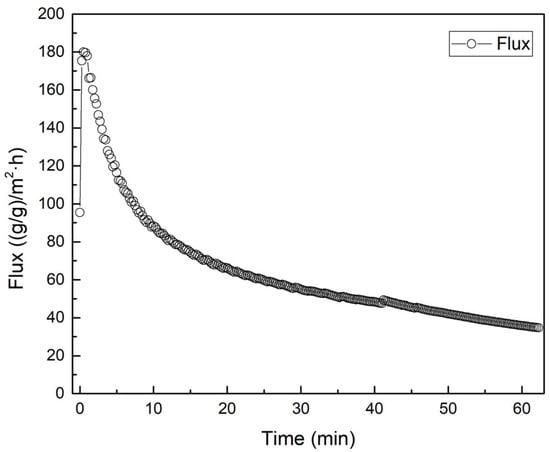 Figure 13 presents the normalized filtration flux as a function of time, based on the data from Figure 11. In this context, the normalized flux is defined as the volume of water removed per unit of dry sludge solids and filtration area, expressed in (g/g)/m2·h. The initial value was normalized to 100% to facilitate relative comparison. At the beginning of filtration, the normalized flux reached approximately 180 (g/g)/m2·h, indicating high initial water removal per unit solids. The flux then declined rapidly, dropping to 50% of its original value within the first 10 min, and further decreasing to approximately 35–40% by 30 min. At the end of the 60 min cycle, the normalized flux stabilized at around 30–33% of the initial value (~60 (g/g)/m2·h). This reduction indicates a significant decline in water removal efficiency per unit of cake mass over time, primarily due to cake thickening and increased resistance associated with compressive consolidation. During the early stages of filtration, each gram of dry sludge could release up to 180 g of water per hour per unit area. However, in the latter stages, only about 60 g of water was removed per hour under the same conditions, reflecting reduced filtration performance due to cake compaction. The observed flux decay trend in Figure 13 corresponds closely to the absolute flux behavior shown in Figure 12 [35,39]. Additionally, the slope of the normalized flux curve became shallower after the pressure increase at the 30 min mark, indicating that pressure augmentation helped delay further deterioration in specific dewatering efficiency. Such results are consistent with previous studies reporting that compressible sludge cakes exhibit a sharp initial decline in flux, followed by stabilization at lower rates. Mahmoud et al. [42], for example, demonstrated that in wastewater sludge filtration, flux dropped rapidly within the first several minutes and stabilized thereafter, emphasizing the importance of optimizing early-stage operating conditions to maintain higher dewatering rates. The present findings reinforce this recommendation, highlighting that adaptive pressure control strategies can effectively mitigate the decline in normalized flux, thereby improving overall process efficiency in sludge dewatering operations.