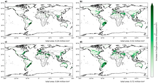 Candidate sugarcane cultivation areas (thousand km2) in regions with high maritime energy demand. Left panels (a,c) consider coastal-adjacent allocation areas, applying a ≤~400 km shoreline mask to prioritize port-proximate siting; right panels (b,d) depict the regions with high maritime energy demand not limited to coast adjacency.