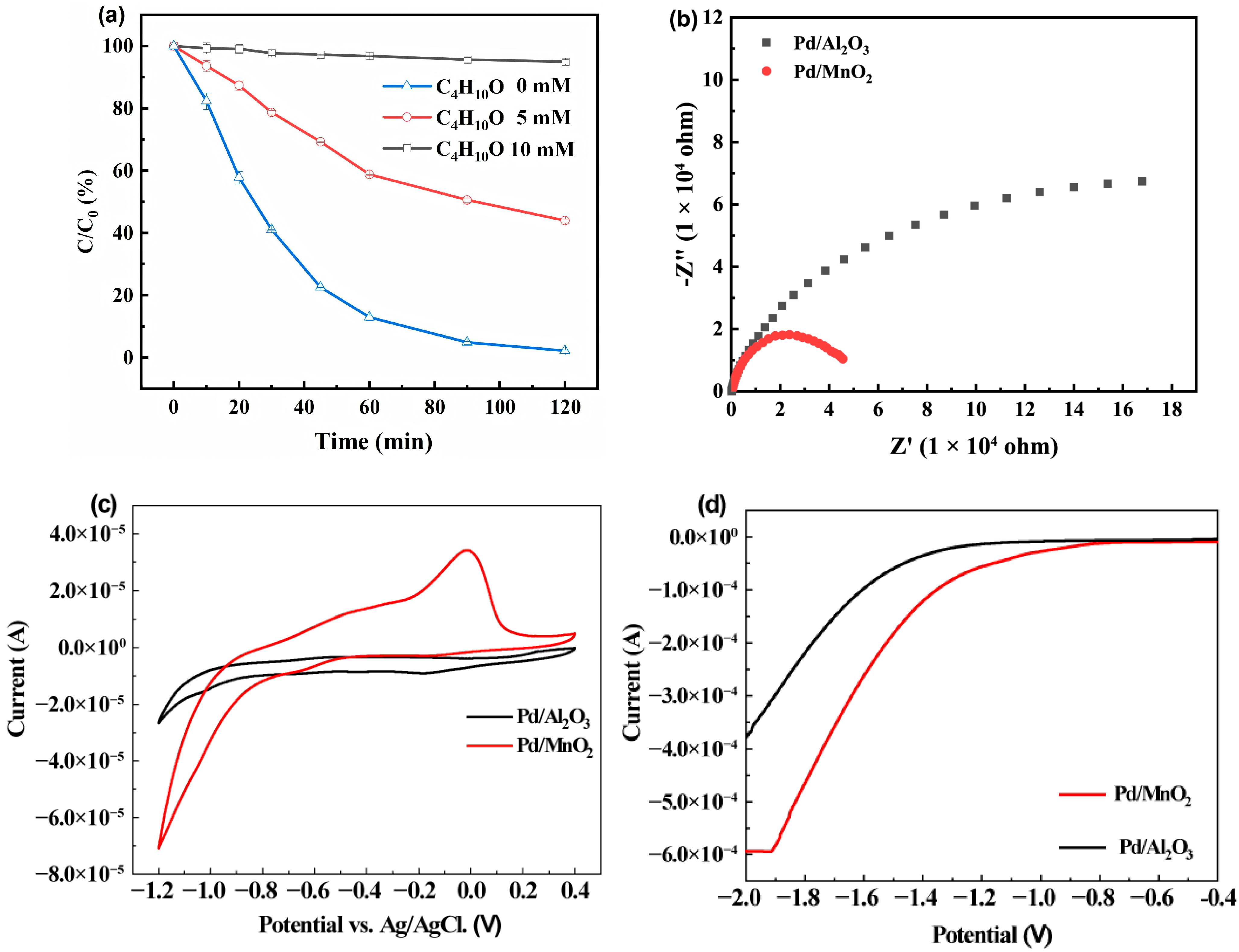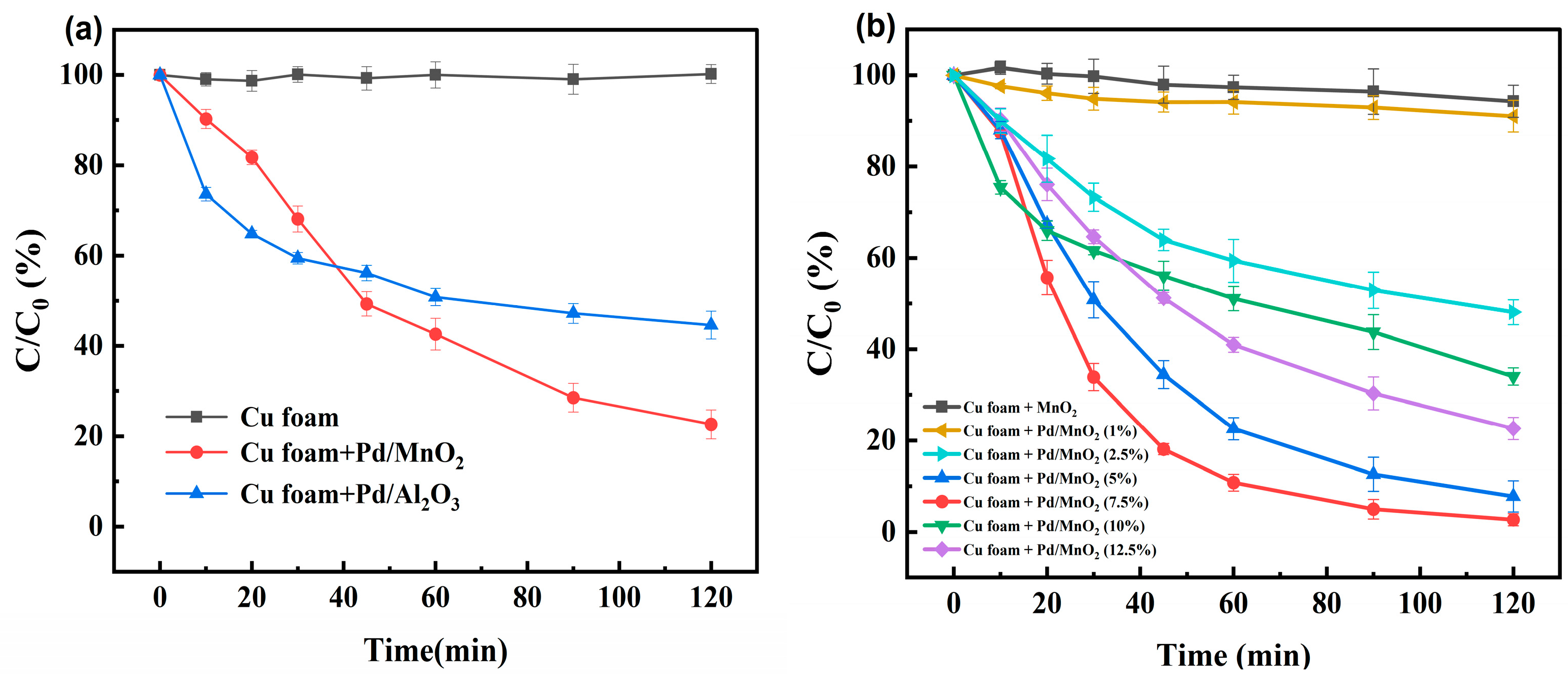 - Li, J.; Peng, Y.; Zhang, W.; Shi, X.; Chen, M.; Wang, P.; Zhang, X.; Fu, H.; Lv, X.; Dong, F. Hierarchical Pd/MnO2 nanosheet array supported on Ni foam: An advanced electrode for electrocatalytic hydrodechlorination reaction. Appl. Surf. Sci. 2020, 509, 145369. [Google Scholar] [CrossRef]