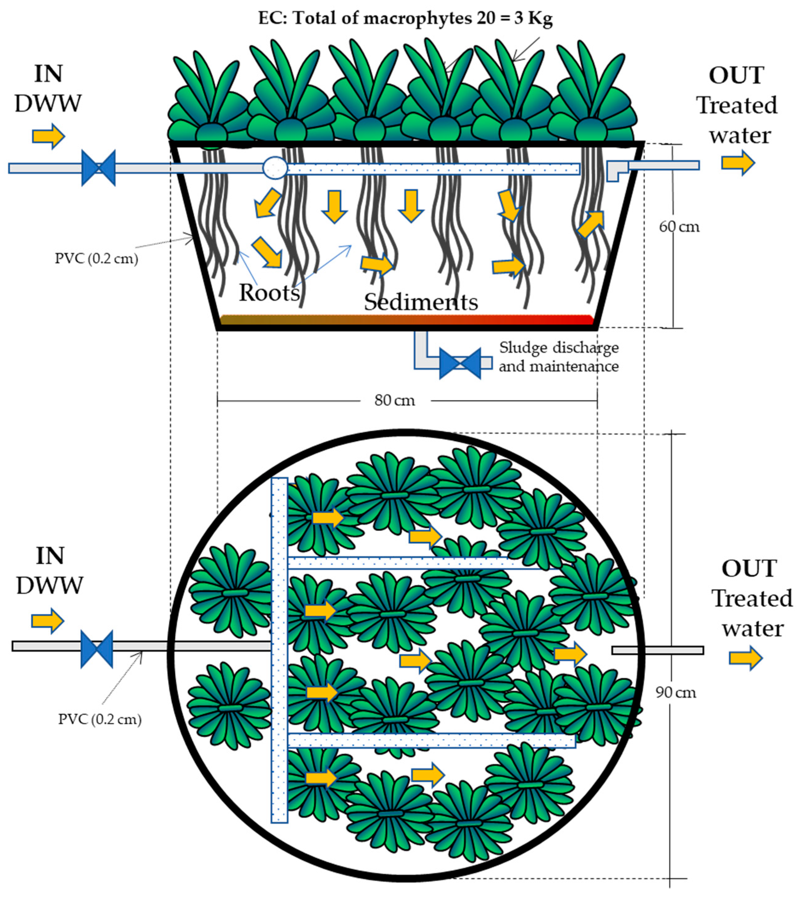 - Rasool, S.; Ahmad, I.; Jamal, A.; Saeed, M.F.; Zakir, A.; Abbas, G.; Seleiman, M.F.; Caballero-Calvo, A. Evaluation of Phytoremediation Potential of an Aquatic Macrophyte (Eichhornia crassipes) in Wastewater Treatment. Sustainability 2023, 15, 11533. [Google Scholar] [CrossRef]