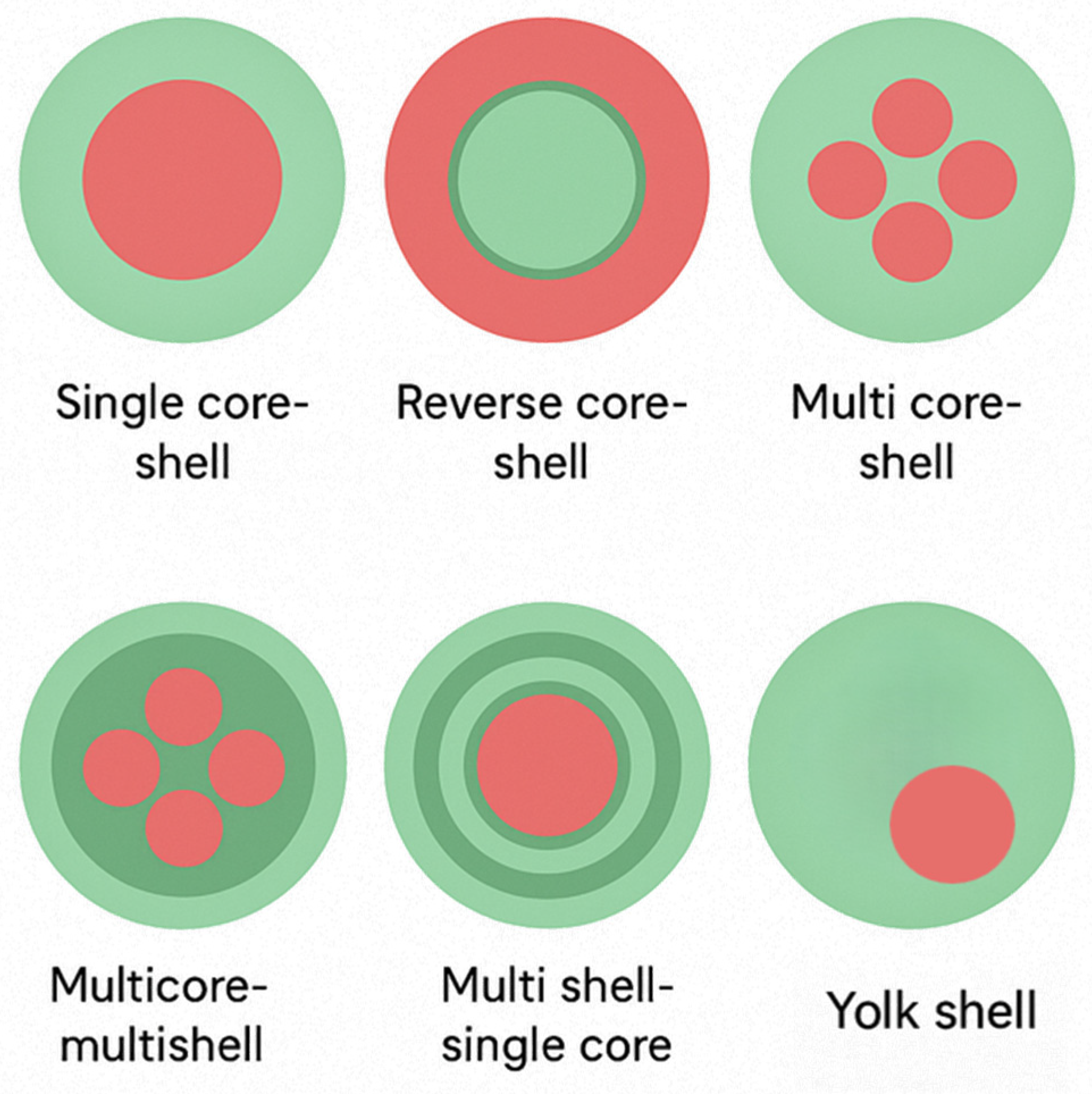 The loss of capacity in CaO is mainly attributed to two phenomena: (i) sintering effect at high temperature that closes some of the available pores and (ii) formation of a layer of CaCO3 that inhibits the penetration of CO2 to the core of particles [102]. Recent research has focused on improving the CO2 adsorption properties of CaO and MgO through several strategies: (i) Forming binary CaO-MgO metal oxides, where MgO inhibits the sintering of CaO, thereby improving its structural stability [103]. (ii) Modifying CaO and MgO with other metal oxides such as La2O3 and Al2O3, which act as stabilizers at high temperatures to reduce sintering or enhance chemisorption performance. (iii) Producing nanopowders and/or mesoporous particles with increased surface area, larger pore volume, and more active sites to boost CO2 uptake [36,104]. (iv) Engineering faceted metal oxides dominated by the crystallographic plane, which offers a higher density of low-coordination sites favorable for CO2 adsorption [100]. (v) Incorporating CaO and MgO into core–shell nanoparticle (CSN) architectures, either as the core or the shell, to optimize structure–property relationships for enhanced CO2 sorption [35]. As illustrated in Figure 7, various CSN designs are being explored to maximize adsorption efficiency.