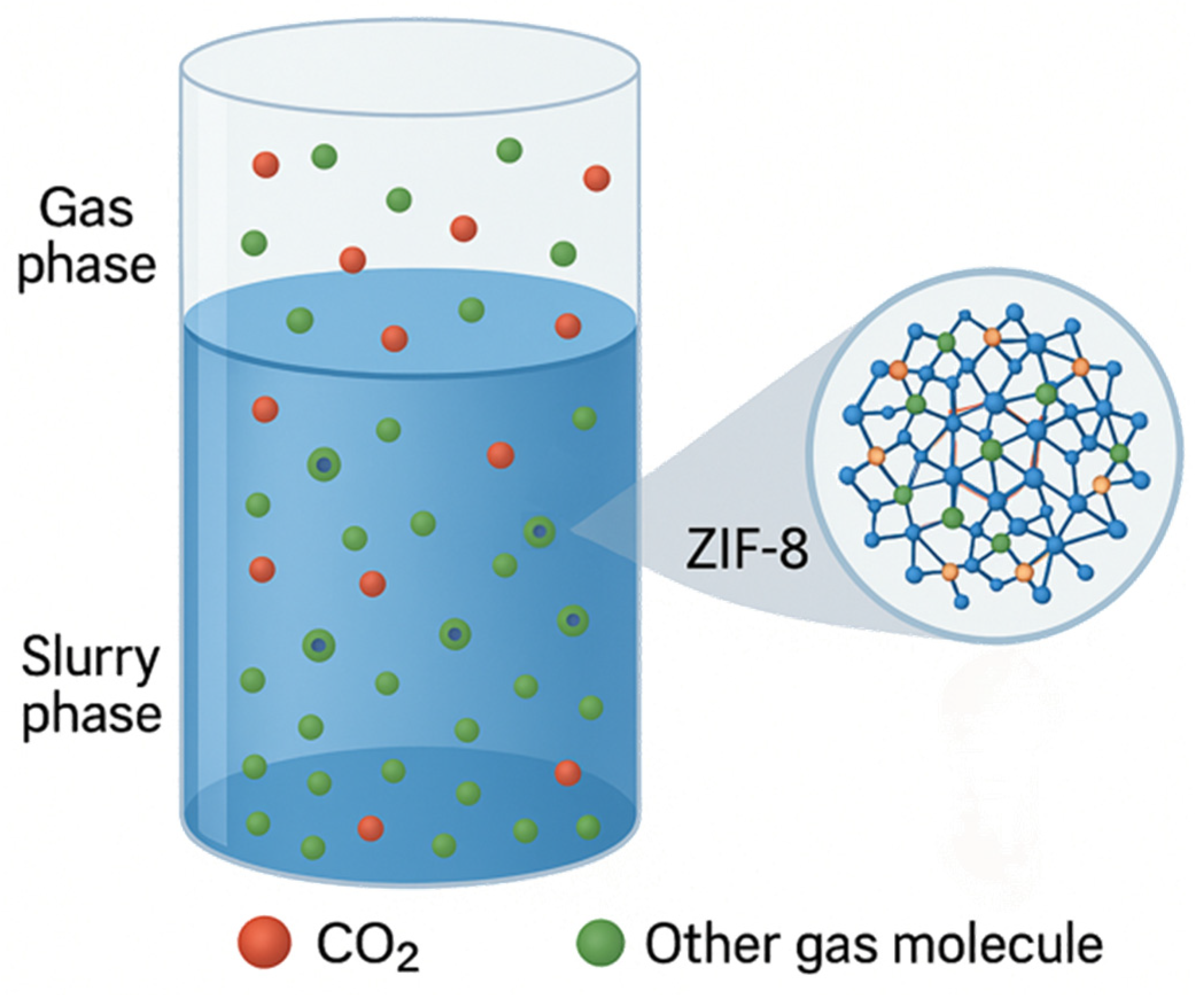 This class of hybrid sorbents consists of slurries in which solid adsorbent particles are suspended in a liquid absorbent. For example, slurries of MOF particles in an amine-based solution can provide a hybrid solid-adsorption/liquid-absorption capture process, as illustrated in Figure 8 [106]. In such systems, MOFs are selected or engineered to have pores small enough to prevent saturation by the liquid absorbent molecules, yet large enough to allow CO2 molecules to diffuse in and be adsorbed.