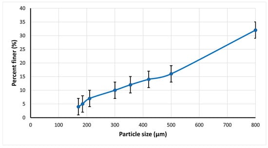 Coffee grounds waste was collected from a commercial espresso machine in the Edward Herbert Building cafeteria of Loughborough University (Figure 1), consisting primarily of Arabica coffee blends, which were then used as the adsorbent for carrying out all fixed-bed horizontal column adsorption studies reported herein. The chemical composition of the coffee grounds characterised by EDX (Energy Dispersive X-ray) analysis is presented in Table 1. The chemical composition of a material can help determine its physical and chemical properties and, thereby, its way of reacting with other materials. The particle size of the coffee grounds was obtained by sieve analysis in a mechanical shaker. The average particle size was 643.6 µm, ranging from 420 µm to 800 µm (Figure 2).