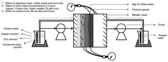 In this study, the effects of different contact times (e.g., 0.5 h, 1 h, 2 h, 3 h, 4 h, 6 h, and 8 h), different metal concentrations (2.5 ppm and 5 ppm copper, 10 ppm and 25 ppm zinc), and different adsorbent types (e.g., treated coffee waste and a 50/50 mixture of coffee waste and rice husk biochar) were examined to help understand the copper and zinc removal efficiency from water. The specific initial metal concentrations were selected based on the WHO guideline values for drinking water [24]. The concentration of copper and zinc (before and after going through the adsorbent) was then determined using a UV-Vis spectrophotometer (Agilent Technologies LDA UK Limited, Cheshire, UK).