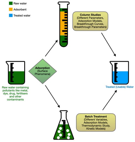 Batch adsorption is a conventional and efficient technique for removing different pollutants from both real and synthetic contaminated water [25]. It is particularly suitable for small amounts of effluent with a low pollution load. The process involves using a specialised container, reactor, or tank, where different key operational parameters, including stirring speed, pH, concentration of the adsorbate, dosage of the adsorbent, temperature, duration of contact, and particle size, are systematically regulated (Figure 6) [25]. The adsorbent is removed from the water once it reaches equilibrium. Batch adsorption has various advantages over other techniques: it is simple, easy, and inexpensive, making it a popular choice for researchers to evaluate the feasibility of adsorbent–adsorbate systems [25]. However, its major drawback is that it is only practical for small-scale applications due to the limited amount of adsorbate used, making it less suitable for industrial purposes [26].