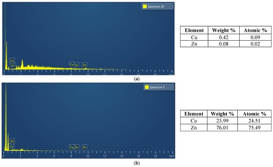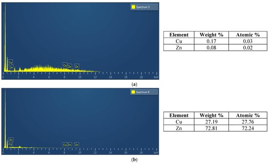 EDX analysis was performed on the surface of coffee ground particles before and after the adsorption study (Figure 8a,b). The results confirmed the presence of adsorbed metals with a percentage of 27.19 wt% for Cu and 72.81 wt% for Zn (Figure 9b), supporting the efficient removal of metals by the coffee grounds. Comparable results for coffee grounds have been recorded in previous research [9,29,30], where the surface morphology and particle size were similar to the current study.