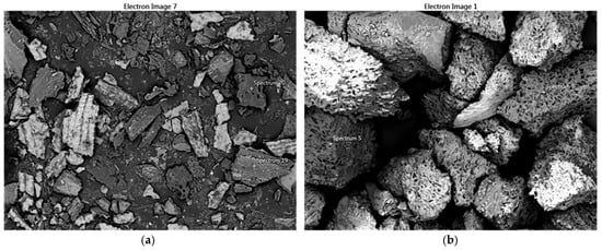 The adsorbent properties, texture, pore space, and surface porosity were studied using SEM. This technique characterises the elemental compositions along with the amount present (% weight). Figure 7a,b illustrate the coffee grounds’ surface structure before and after metal adsorption. They clearly show coarse, irregular particles of coffee grounds with many pores, providing potentially large surface areas for metals to be adsorbed onto. Pore morphology, such as their size, shape, and interconnectivity, plays a crucial role in the efficiency of adsorption. Based on their dimensions, pores are generally classified as micropores (less than 2 nm), mesopores (2–50 nm), and macropores (greater than 50 nm). Each category affects how adsorbates interact with the material, influencing surface area availability, access to adsorption sites, and the overall adsorption mechanism.