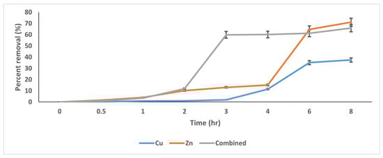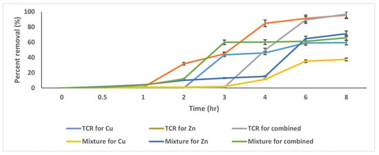 The results of the experiments to determine the equilibrium time for the effective removal of metals using the 50/50 TCR and rice husk mixture are presented in Figure 12. The equilibrium was achieved around 6 h, with the highest removal of 37.39% Cu (5 ppm) at 8 h. For Zn (25 ppm), the equilibrium was achieved around 6 h, with the highest removal of 71.06% at 8 h. For combined Cu and Zn, the equilibrium was reached around 3 h, with the highest removal of 65.79% at 8 h. The results also plot as a bell-shaped curve, indicating a gradual increase in the percent removal over time, as expected due to the vacant active sites on the adsorbent. This plot can be described in three different regions: (1) 0 to 1 h, where it shows a slow adsorption of ions; (2) 1 to 3 h, where it displays a gradual equilibrium; and (3) 3 to 8 h, where it reaches the equilibrium state due to external diffusion and surface adsorption. Azouaou et al. [20] investigated the effect of coffee waste and orange peel mixture on adsorbing lead from an aqueous solution, where the equilibrium was achieved in 30 min. Vo et al. [21] investigated the effect of coffee ground and bamboo powder mixture on removing the industrial dye rhodamine B, where the equilibrium was achieved in 230 min. However, these results were dissimilar to the current study because of the difference in the mixture of materials and pollutants removed.