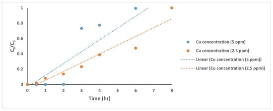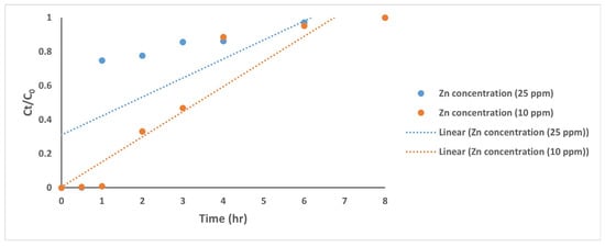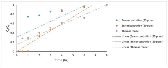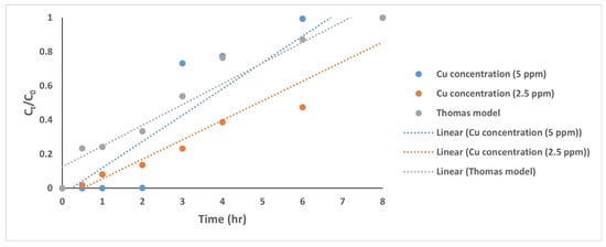 Adsorption models were studied for different initial metal concentrations (2.5 ppm and 5 ppm copper, 10 ppm and 25 ppm zinc) and contact times (e.g., 0.5 h, 1 h, 2 h, 3 h, 4 h, 6 h, and 8 h), where 80 g of adsorbent was added to 200 mL metal solution. The breakthrough curve was obtained for both Cu and Zn, and the Thomas model was fitted to determine the adsorption parameters.