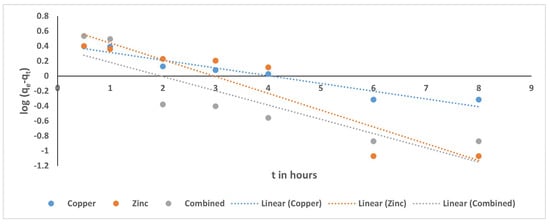 The first-order reaction kinetics were applied to determine the adsorption rate constants for copper, zinc, and combined metal removal. The results obtained are presented in Table 4. Figure 19 presents the pseudo-first-order kinetic model fits. The plots of log (qe − qt) versus time exhibited linearity for each metal, indicating conformity with the pseudo-first-order model. The values of K1 and qe were determined from the slopes and intercepts of these plots, as shown in Table 4.