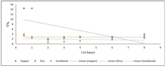 The second-order reaction kinetic was also applied to determine the experimental data for copper, zinc, and combined metal removal. As illustrated in Figure 20, linear plots of t/qt against time were obtained for all metals. The values of K2 and qe were derived from the slopes and intercepts of these curves, respectively, and are presented in Table 4.