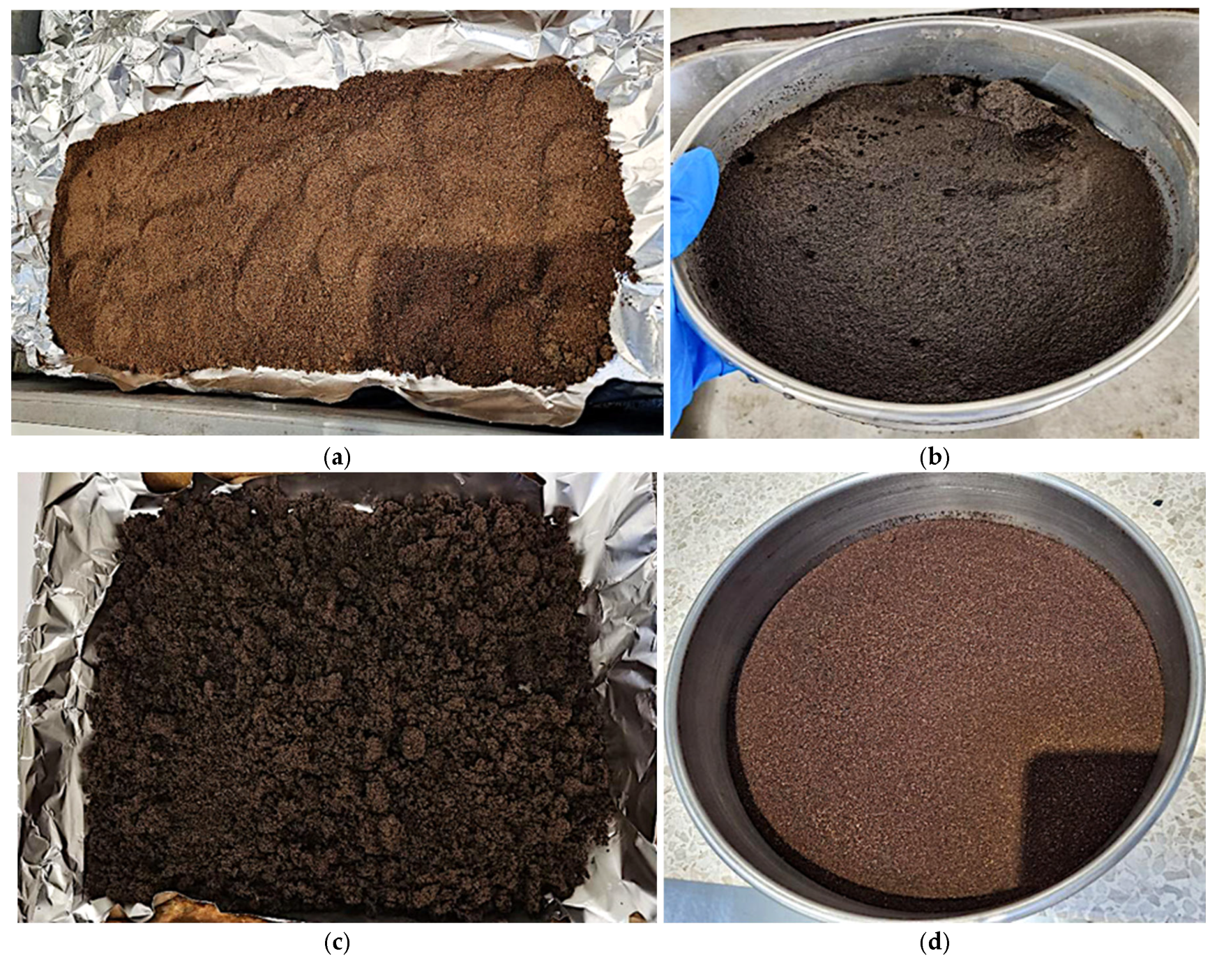 - Gora, E.H.; Saldana, S.G.; Casper, L.M.; Sijercic, V.C.; Giza, O.A.; Sanders, R.L. Effect of Exhausted Coffee Ground Particle Size on Metal Ion Adsorption Rates and Capacities. ACS Omega 2022, 7, 38600–38612. [Google Scholar] [CrossRef] [PubMed]