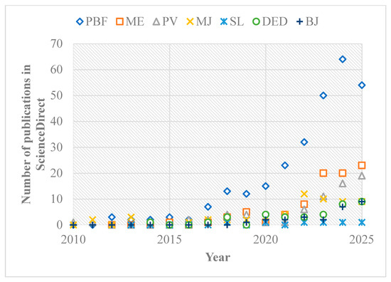 Number of publications in the ScienceDirect database indicating the AM systems that are used for printing hydrogen energy parts: Data Source: (https://www.sciencedirect.com/search?qs=%22additive+manufacturing%22+OR+%22hydrogen+economy%22, accessed on 10 June 2025).