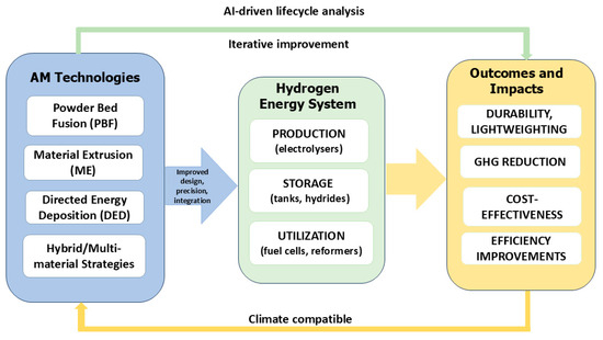 Flowchart of AM in the hydrogen economy, showing how AM technologies enhance hydrogen energy components and translate into improved efficiency, durability, lightweighting, reduced emissions, and cost-effectiveness. The feedback loop indicates iterative optimization via AI-driven design and techno-economic analyses.
