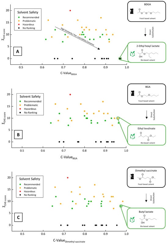 Direct substitution of three solvents: (A) butyl diglycol acetate (BDGA), (B) butyl glycol acetate (BGA) and (C) dimethyl succinate. Each data point represents a bio-based solvent listed in the solvent catalog and is characterized by the sum of EHS (environment, health, safety) score according to CHEM21 solvent guide and the TOPSIS-C-value. All solvents are assigned to certain safety groups depending on EHS data according to CHEM21 (recommended: green, problematic: yellow, hazardous: red and no Ranking: black). The solvent to be substituted is shown on the top right, while the replacing bio-solvent is displayed on the bottom right.
