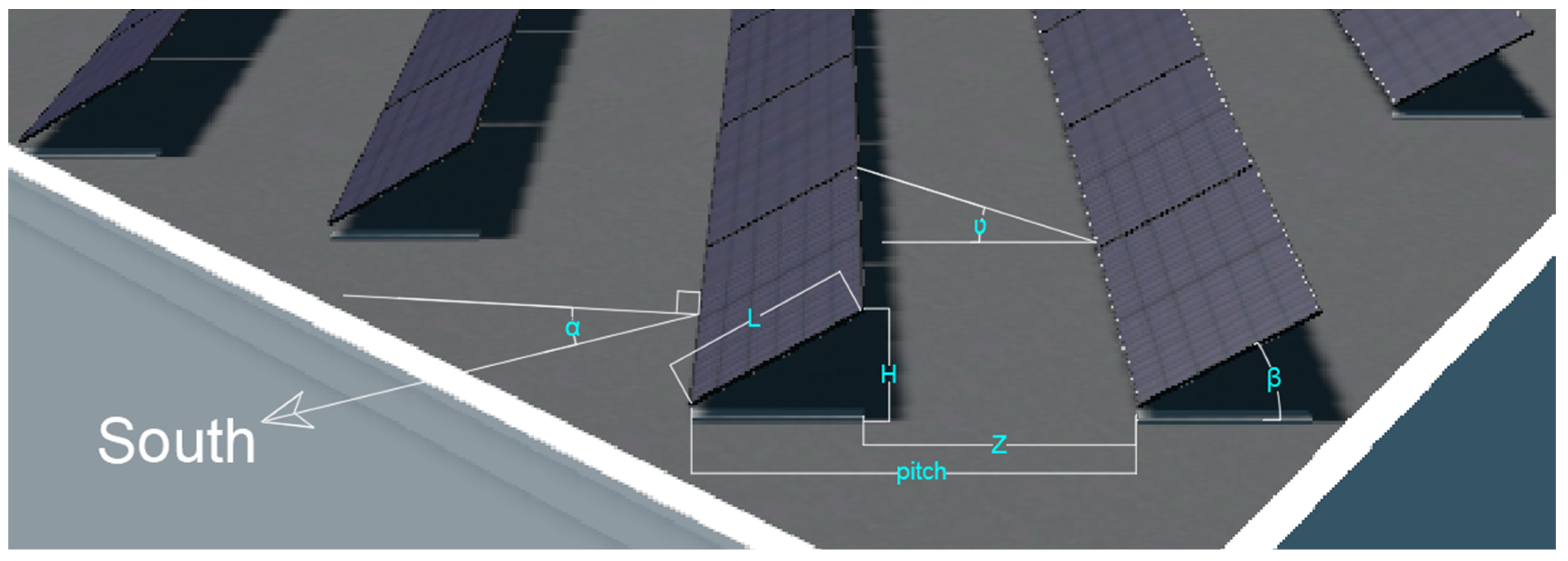 - For the flat rooftop system (Figure 4b), the modules are installed with a 2 m pitch, defined by the distance between the centres of the modules, in such a way that the entire available area is occupied. The place between modules (Z) comes from the minimisation of the losses caused by module shadowing based on the solar height (υ) at the mean latitude of Abruzzi (φ = 42.102718), according to Equations (6) and (7):