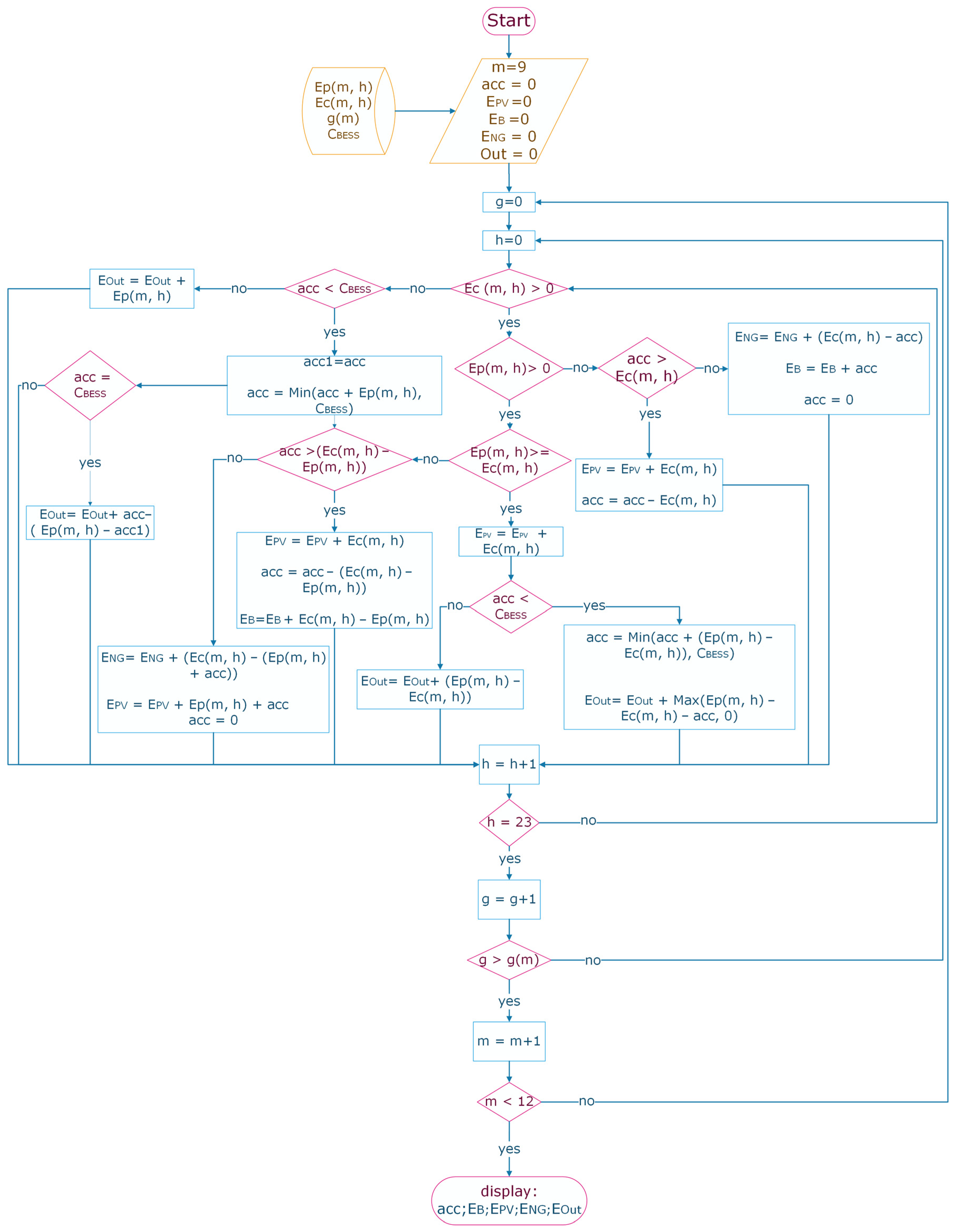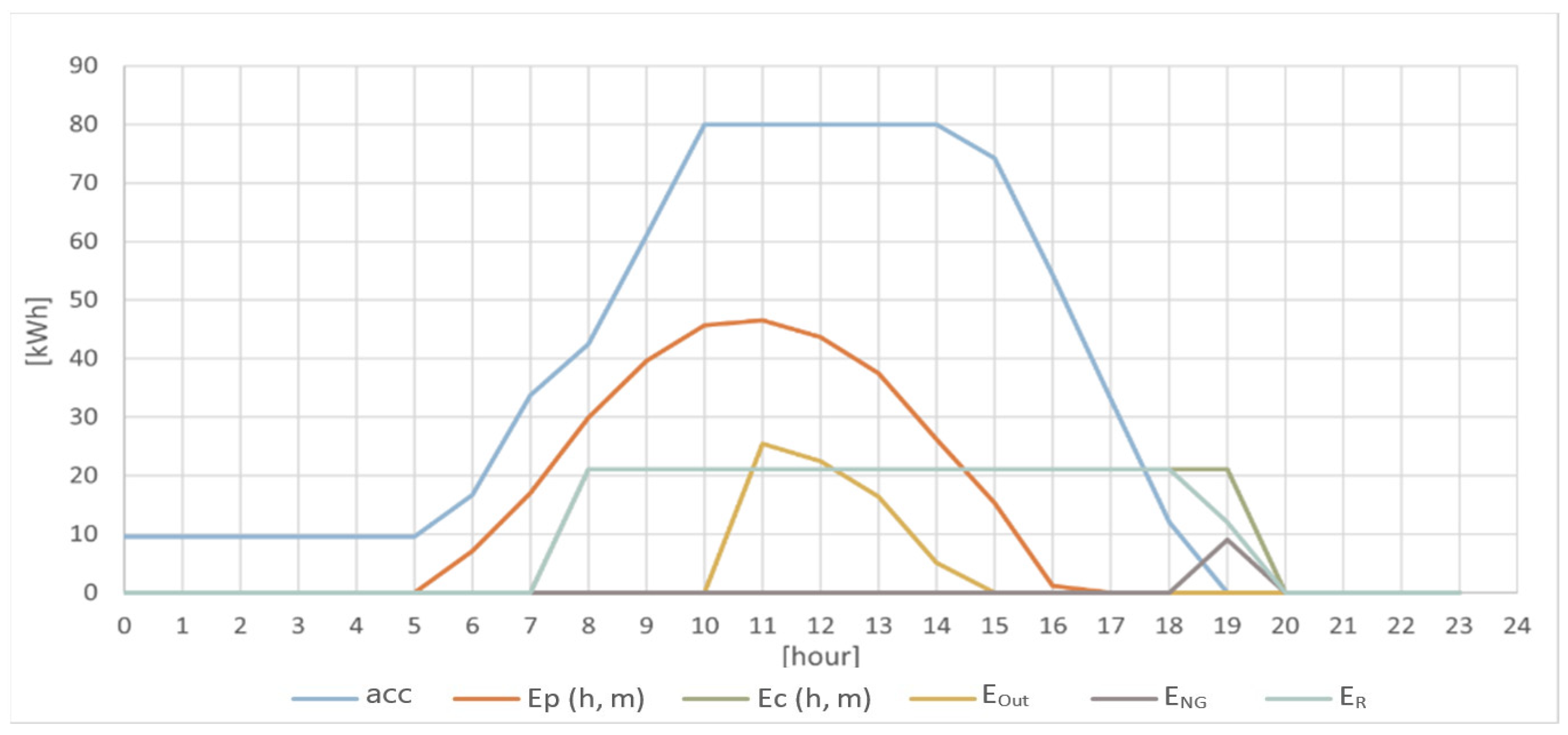 - The fourth step in the process was the implementation of an algorithm that simulates the interaction between NG, PV, and BESS, as described in 2.4. This algorithm was designed to compute: the invariant of the self-consumed energy, the total energy produced by PV, the energy stored by the battery, and the energy fed into the grid. The sizing of the battery in the PV+BESS system is therefore determined by assuming the minimisation of CF in the SPV+B.