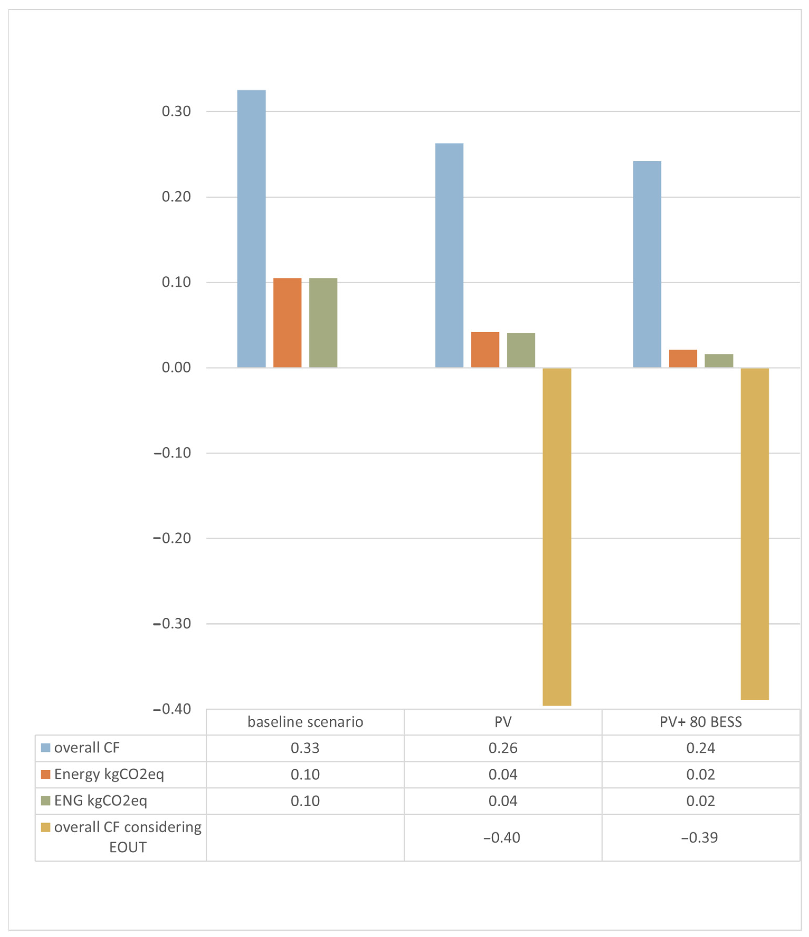 - The industrial phase includes primary and secondary packaging. In this regard, previous studies have shown how this is a particularly energy-intensive phase that contributes significantly to GHG emissions [44,46,47]. In this study, the utilisation of the aforementioned packaging data facilitated the formulation of more in-depth assessments of the reduction in the PV system impact.