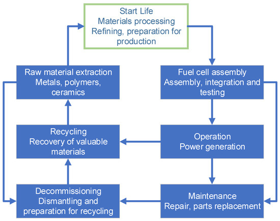 Life cycle flowchart of a PEM fuel cell system, including materials, operation, maintenance, and end-of-life stages.