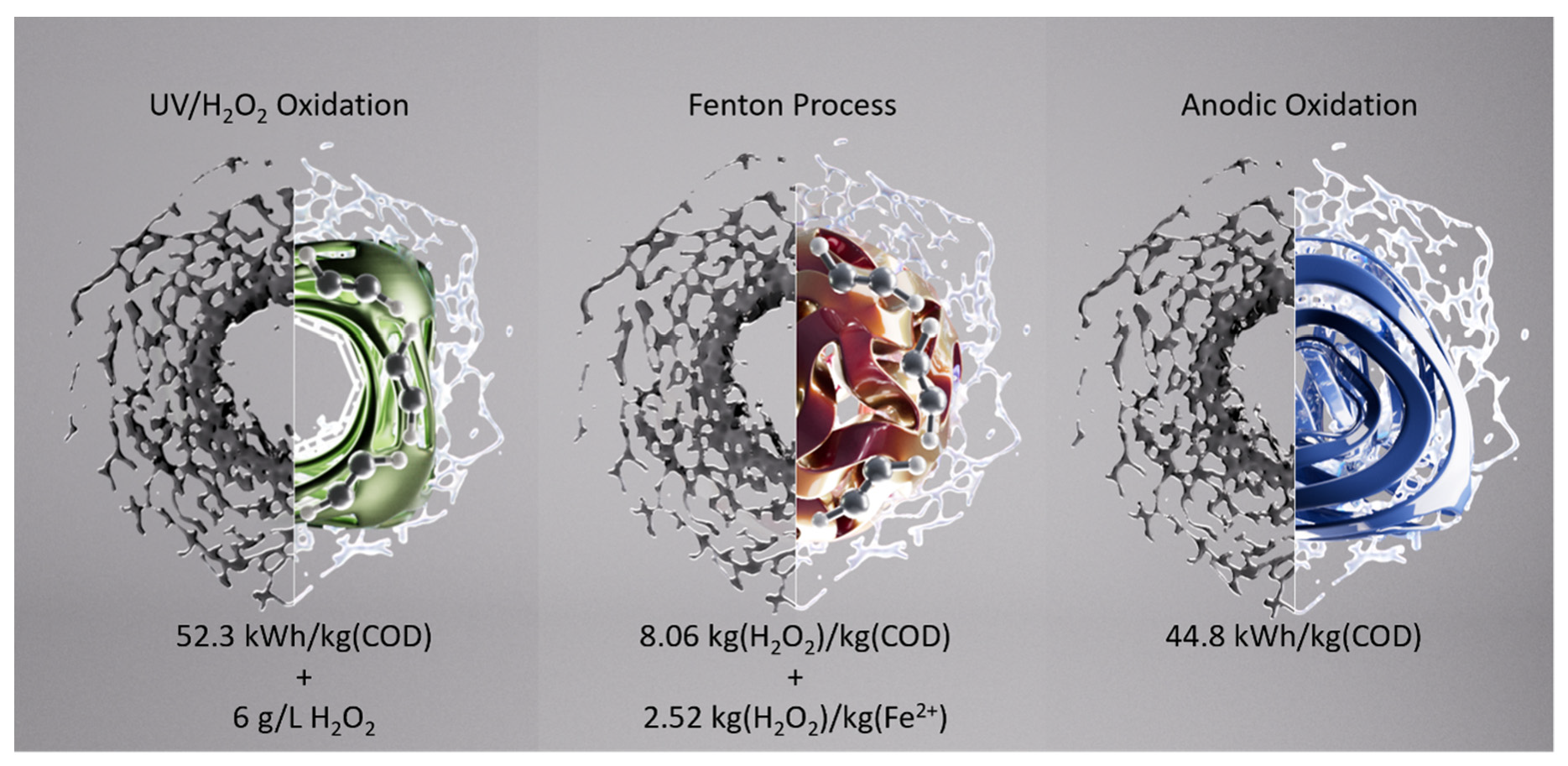 - Evaluate the treatment performance of three AOPs: UV/H2O2 oxidation, the Fenton process and electrochemical oxidation.