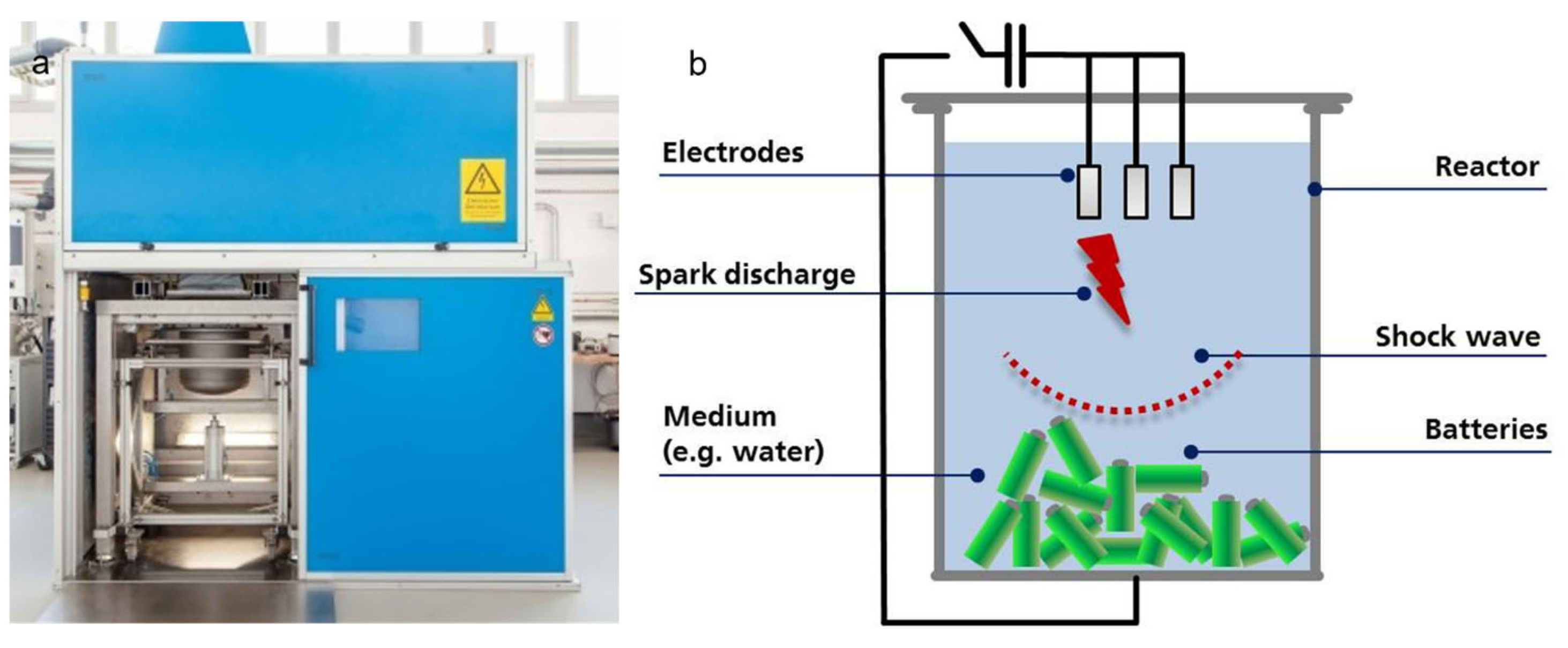 - Öhl, J.; Horn, D.; Zimmermann, J.; Stauber, R.; Gutfleisch, O. Efficient Process for Li-Ion Battery Recycling via Electrohydraulic Fragmentation. MSF 2019, 959, 74–78. [Google Scholar] [CrossRef]