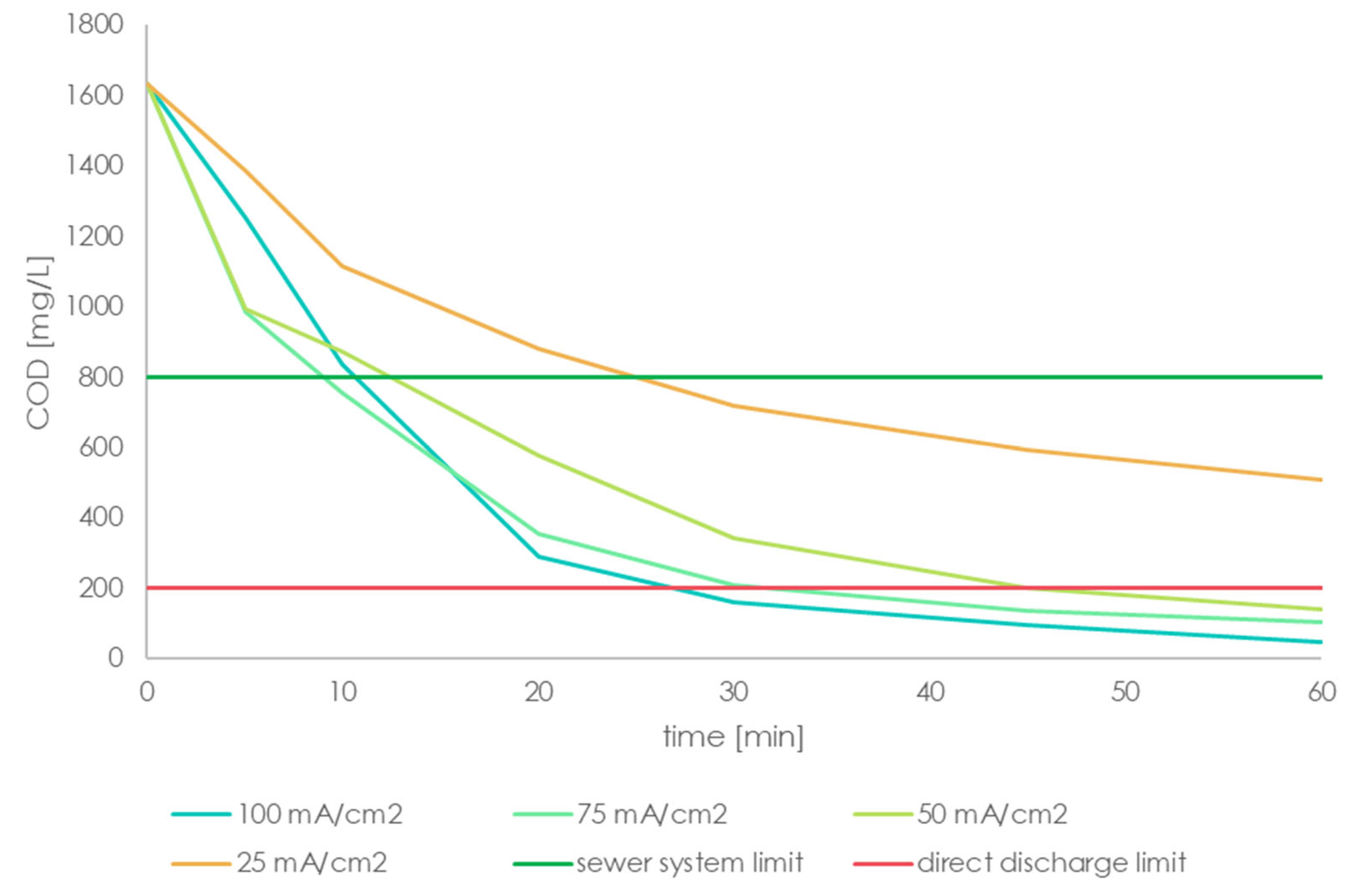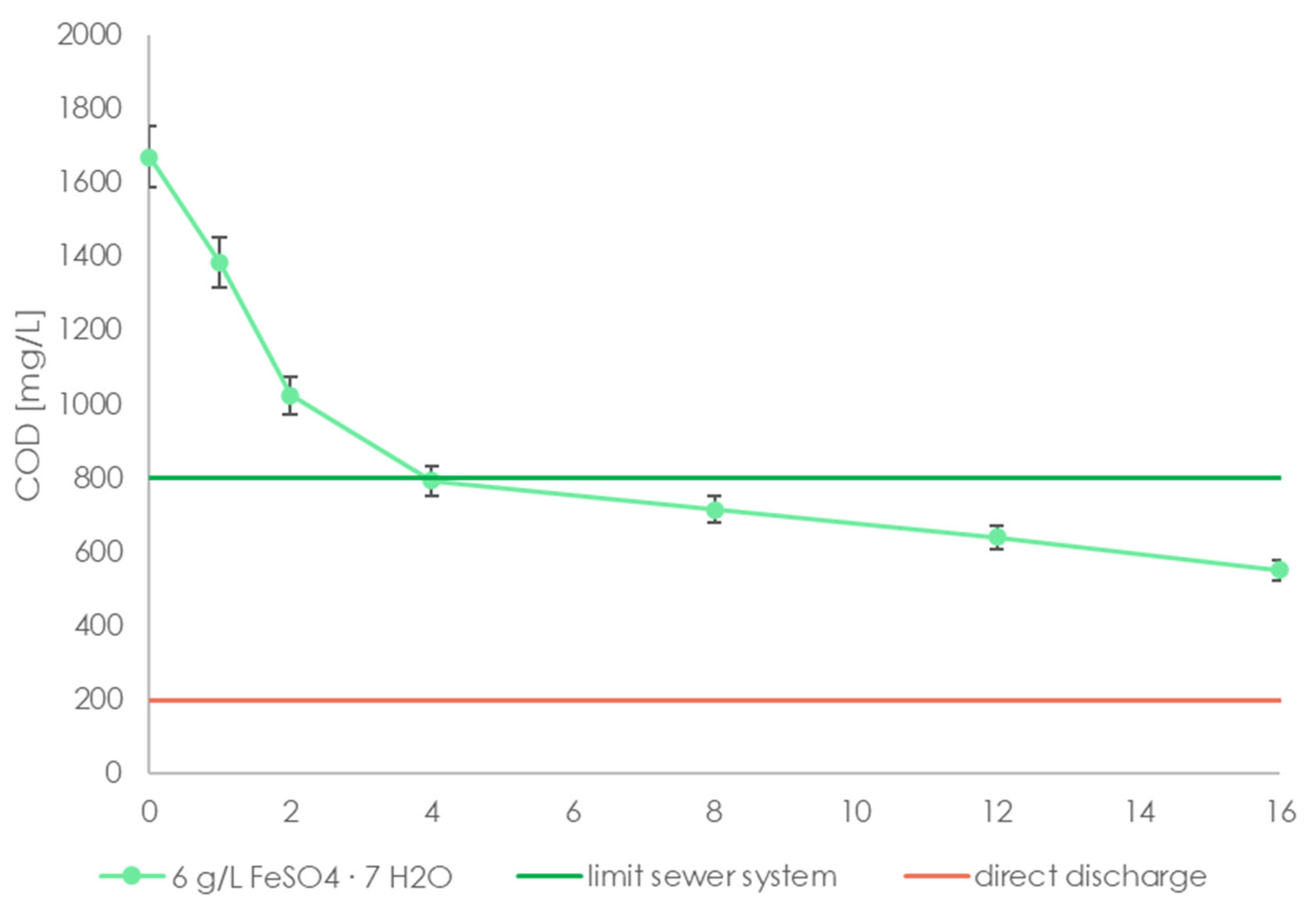 - Direct discharge of industrial wastewater into a water body. According to the German legal framework, the COD needs to be reduced to at least 200 mg/L to comply with the limit values defined in Annex 27, “treatment of waste by chemical-physical plants” [32].