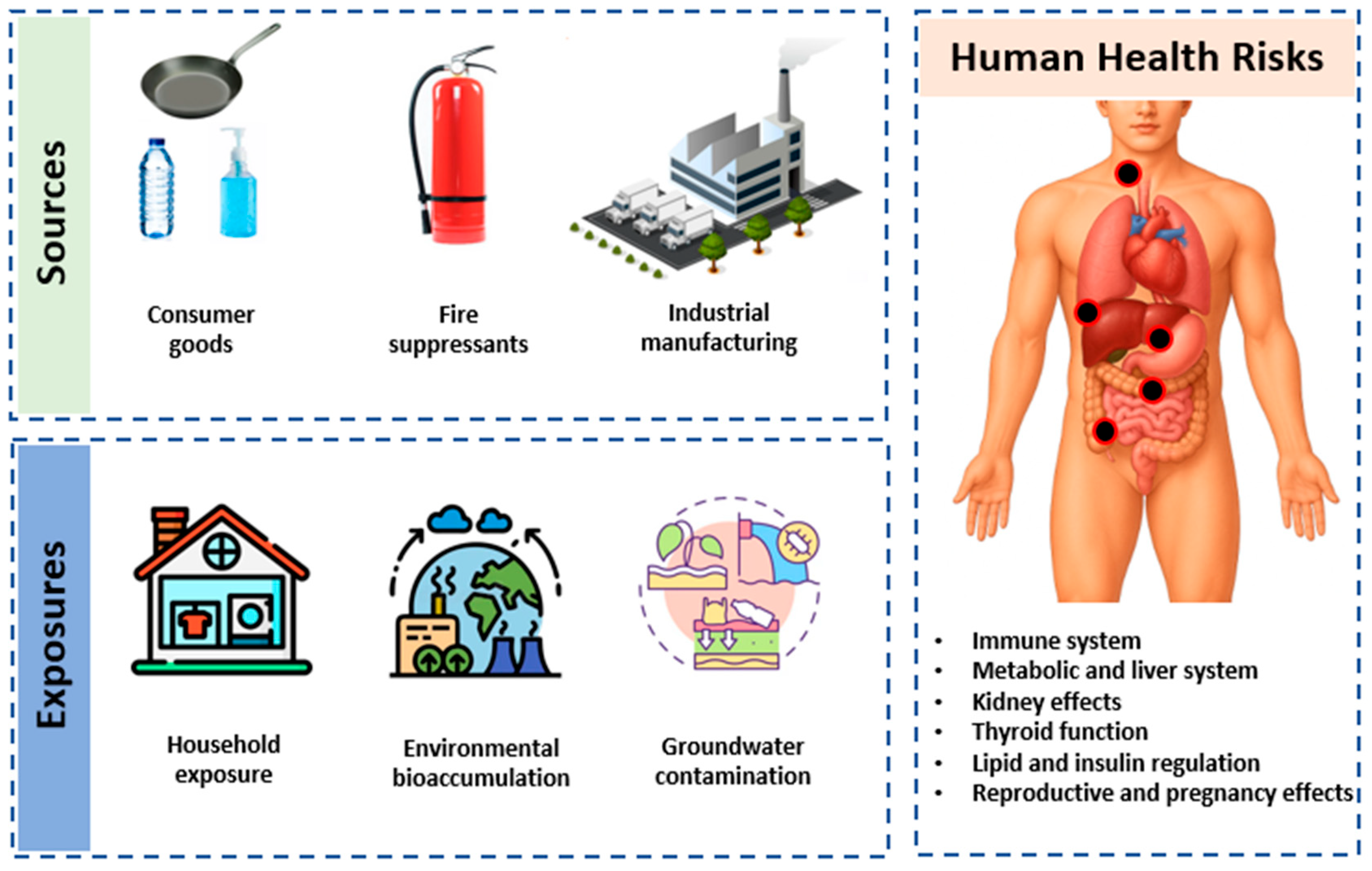 Figure 1 illustrates how PFASs released from consumer products, fire suppressants, and industrial activities lead to household and environmental exposures that ultimately impact multiple human organs and systems, including the immune, metabolic, liver, kidney, thyroid, and reproductive systems.