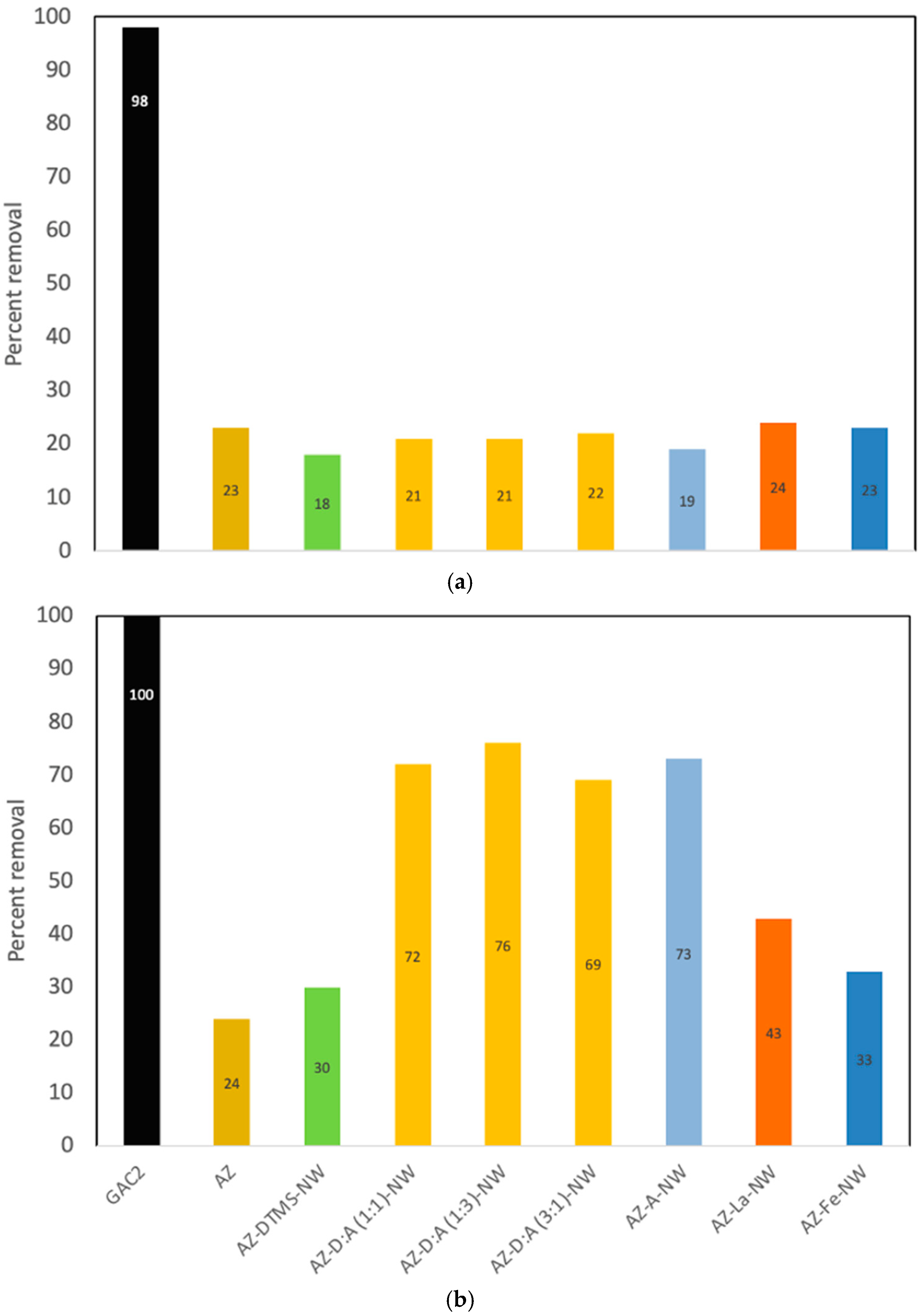 Adsorption performance was subsequently evaluated for each PFAS individually at an initial concentration of 100 μg/L. Nine adsorbent systems were tested in these single-solute experiments: (1) GAC2 (coal GAC, baseline carbon), (2) AZ (raw), (3) AZ-DTMS-NW, (4) AZ-D:A(1:1)-NW, (5) A-D:A(1:3)-NW, (6) AZ-D:A(3:1)-NW, (7) AZ-A-NW, (8) AZ-La-NW, and (9) AZ-Fe-NW. This selection covers the range from unmodified to various modifications; note that an NW base was selected for the modified zeolite samples in this phase due to practical considerations, as the acid-washing process would introduce additional preparation steps, increasing both cost and safety concerns. Each adsorbent was used in 100 ppb PFAS solutions for 1 h. This fixed 1 h contact time was applied as a standardized screening condition; therefore, the reported removals represent uptake at 1 h rather than confirmed equilibrium adsorption.