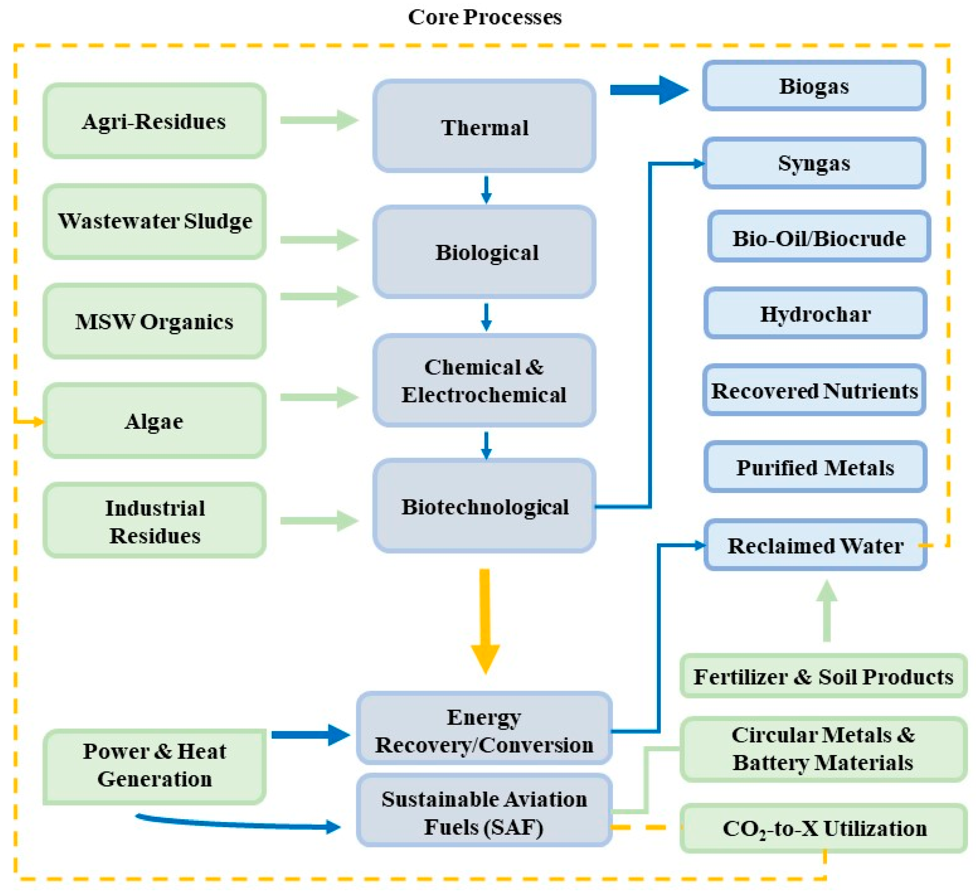 | Waste valorization | By-product recovery, waste-to-energy conversion | Biomass and sludge conversion to biogas and fertilizers [33,34] | Reduced landfill, renewable energy generation |