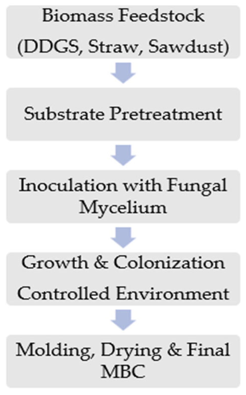 - Jiang, L.; Walczyk, D.; Mooney, L.; Putney, S. Manufacturing of Mycelium-Based Biocomposites. 2013. Available online: https://www.researchgate.net/publication/289663184 (accessed on 8 May 2013).