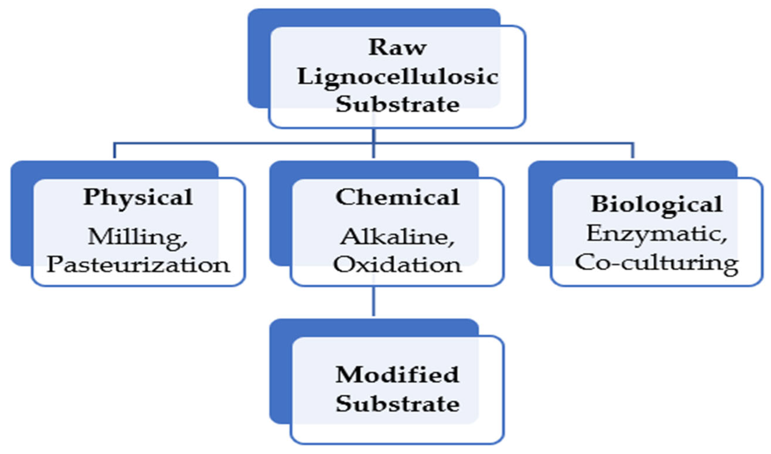 | Chemical | NaOH, H2SO4, H2O2, ozone | Enhances cellulose accessibility; improves fungal binding | Toxicity, pH imbalance, waste disposal issues | [6] |