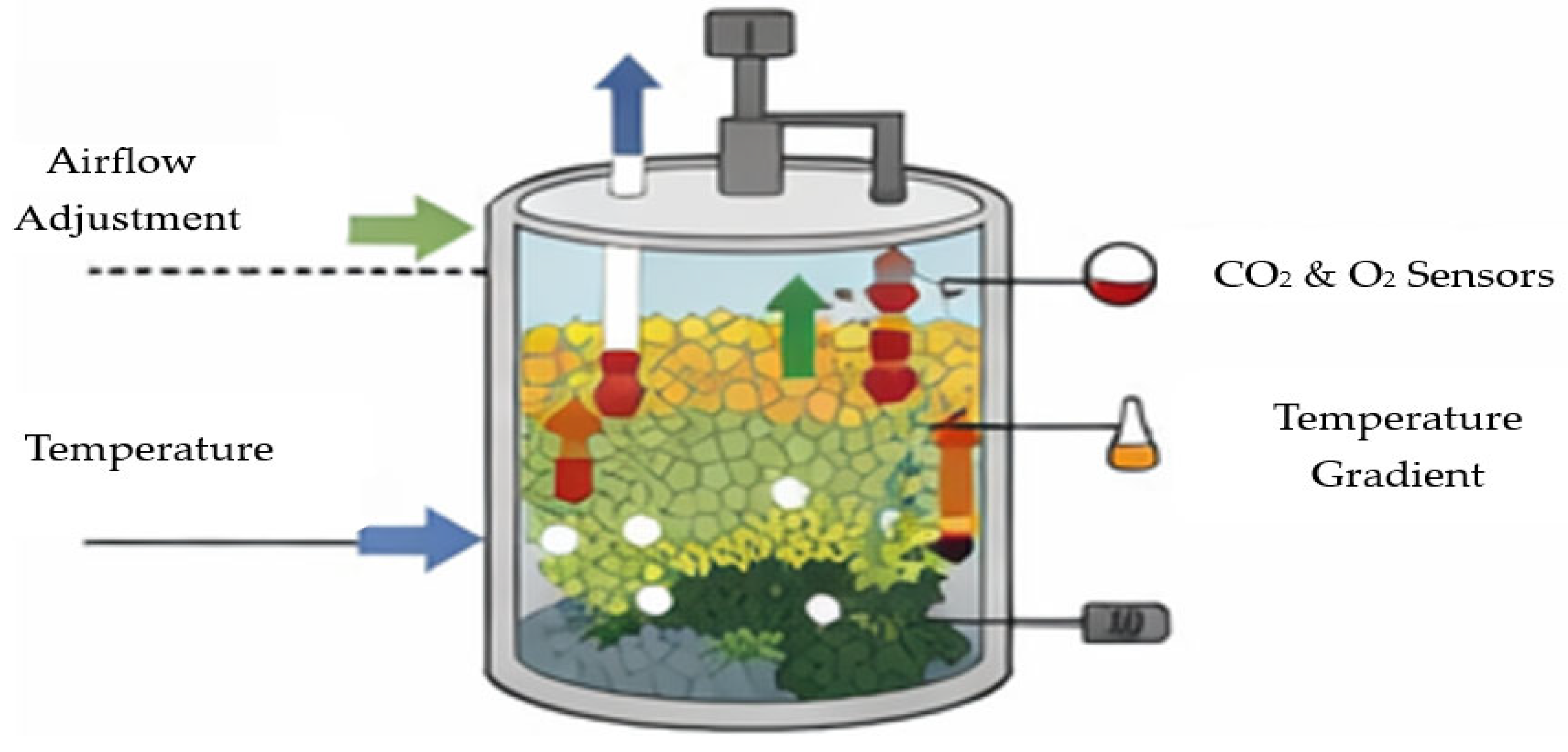 | Aeration | 0.5–2 L air/min/kg substrate | CO2/O2 sensors, forced ventilation | Prevents anaerobic zones and supports aerobic metabolism | [45] |
