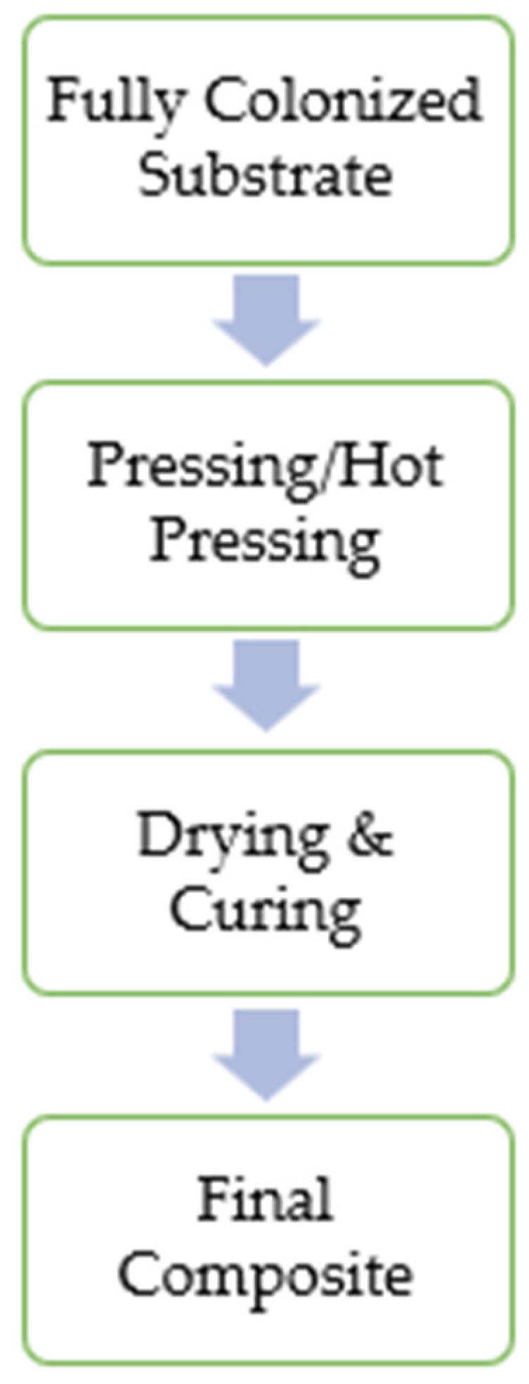 - Madusanka, C.; Udayanga, D.; Nilmini, R.; Rajapaksha, S.; Hewawasam, C.; Manamgoda, D.; Vasco-Correa, J. A review of recent advances in fungal mycelium based composites. Discov. Mater. 2024, 4, 13. [Google Scholar] [CrossRef]