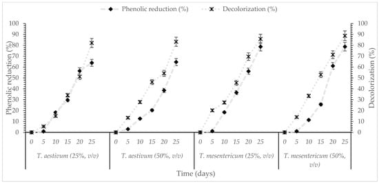 Kinetics of % phenol reduction and % decolorization during cultivation of T. mesentericum in bioreactor on solid nutrient medium supplemented with 50% (v/v) OMW and initial concentration of glucose 30 g/L at T = 25 ± 1 °C. Each point is the mean value of at least three independent measurements per biological replicate, SD (<5%) across two independent biological replicates.